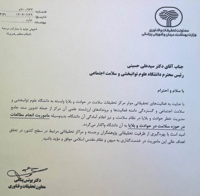 با توجه به فعالیت های تحقیقاتی مرکز تحقیقات سلامت در حوادث و بلایا و گستردگی دامنه فعالیت ها و بروندادهای ارزشمند علمی این مرکز، در تاریخ 29 اردیبهشت ماه 1403 ، ماموریت انجام مطالعات در حوزه سلامت در حوادث و بلایا به دانشگاه علوم توانبخشی و سلامت اجتماعی واگذار شد.